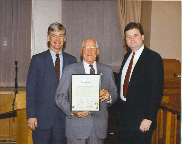 Elliot Couden (center), founder of the Southwest Seattle Historical Society, with former mayor Greg Nickels (right), SWSHS 2005.1.558