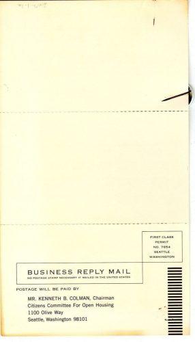 Couden, who was a real estate agent based in White Center, supported the Open Housing Ordinance that inspired this pledge card. In 1964, Seattle voted nearly two to one to keep racial housing discrimination legal. Although the referendum failed, a similar effort was pushed through by City Council four years later.