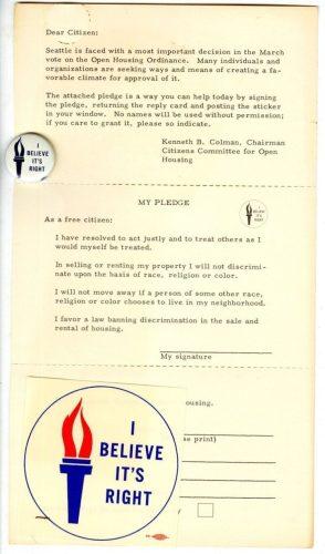 This pledge card, sticker, and pin set comes from the personal collection of the founder of the Southwest Seattle Historical Society, Elliott Couden. It was produced during the Civil Rights Movement in the 1960s, when the Citizens Committee for Open Housing was campaigning to outlaw housing discrimination in Seattle.